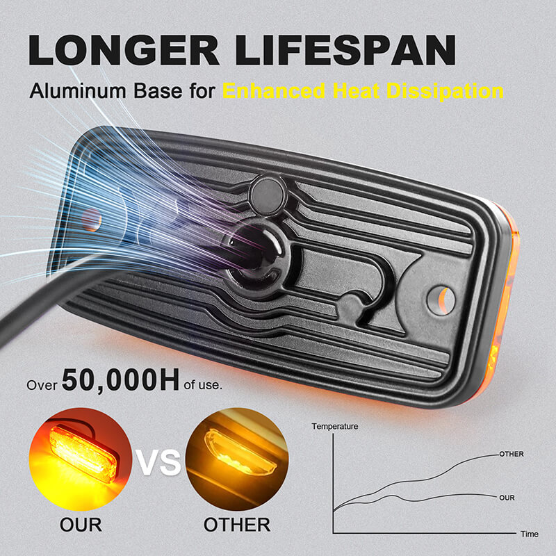 The aluminum base allows for rapid heat dissipation of the marker light for truck, ensuring a long lifespan of over 50,000 hours.
